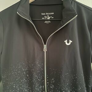 This True Religion bomber jacket in black features a striking speckled gradient effect, adding a unique touch to its classic design. The high collar and full-length zipper enhance its modern appeal, while the fitted, cropped silhouette offers a stylish fit. Perfect for casual outings, this jacket combines comfort and fashion effortlessly.