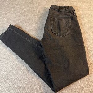 Classic black wash skinny jeans from True Religion featuring light distressing at the knees, signature back pocket stitching, and a flattering stretch fit.