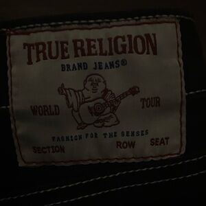 Classic black bootcut jeans, featuring distinctive white stitching. Iconic True Religion branding.