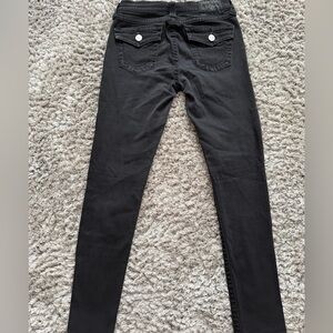 Black ripped jeans, distressed denim, silver studded, grunge style, slim fit, edgy jeans, black skinny pants, metal embellishments, alternative fashion, rebellious look