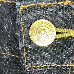 True Religion Blue Dark Wash Metallic Painted Horseshoe Flap Pockets Jeans Sz 31