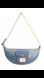 Stylish blue denim crossbody bag. Features front pocket with logo patch. Adjustable cream strap for comfort.