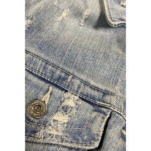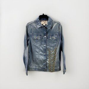 True Religion Blue Denim Distressed Chain Statement Jacket Sz S Biker