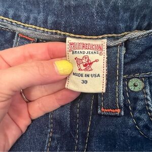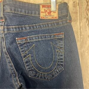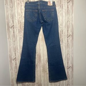 Experience the perfect blend of style and comfort with these True Religion blue jeans. Featuring a flattering flare leg design, these jeans offer a timeless look with their medium-dark blue wash. Ideal for any occasion, they are crafted from durable denim for lasting wear. Excellent condition, size 30