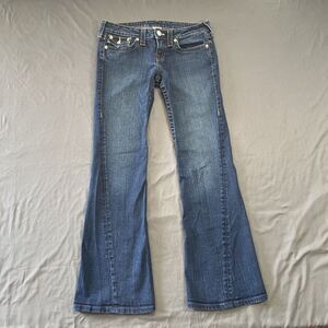 Stylish flare and wide leg jeans. Classic blue denim. True Religion branding.