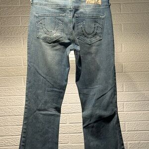 True Religion's Blue Flare Wide Leg Jeans offer a stylish blend of retro flair and modern comfort. The classic flared silhouette widens from the knee, creating a flattering shape that pairs well with any casual outfit. The medium-light wash with subtle fading gives these jeans a lived-in look, while the quality denim ensures durability and a comfortable fit.