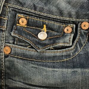 These True Religion jeans showcase a chic flare and wide leg silhouette, enhanced by a rich blue hue. The natural fading and whiskering add a touch of casual elegance, making them perfect for everyday wear.