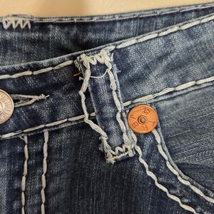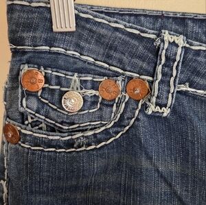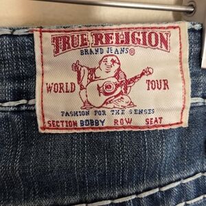 True Religion | Bobby Y2K Curved Seam Boot Cut Low Rise Jeans Contrast Stitching.