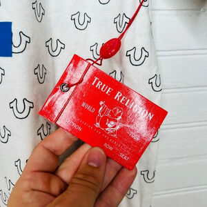 Features: All-over horseshoe logo print, Bold 'TRUE' lettering, Original True Religion tag