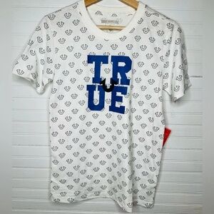 Features: All-over horseshoe logo print, Bold 'TRUE' lettering, Original True Religion tag