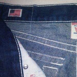 True Religion Brand Jeans, Ricky Straight leg jean, size38, inseam is 27 inches long. Pant leg is cut off at the bottom leaving pant leg slightly frayed. Slightly worn but still in great condition.
