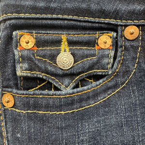 The product is a pair of True Religion Brand Joey low rise denim pants in a size 27. These flared-style jeans feature a zip closure, 5-pocket design, and belt loops. The dark blue fabric is machine washable, making it suitable for year-round wear. With a vintage modern theme and a 33-inch inseam, these True Religion jeans are a stylish and versatile addition to any woman's wardrobe. Made in the USA as part of the True Religion World Tour collection, these jeans offer a regular fit for a comfortable and fashionable look.