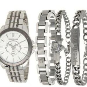 Elegant silver watch with matching bracelets. True Religion branding. Sleek and stylish.