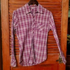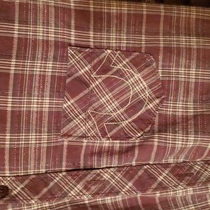 Lovely button down shirt in maroon / purple / pink plaid. Great condition. True Religion logo sewn on front pocket.