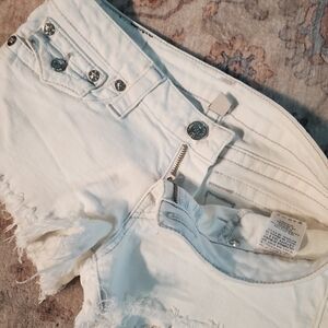 Chic True Religion jean shorts. Cream color with stylish frayed hem. Perfect for casual wear.