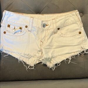 Chic True Religion jean shorts in cream. Features tan stitching and frayed hem. Perfect for casual wear.