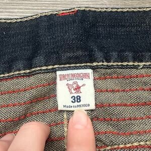 True Religion Dark Faded Blue Mens 38 Distressed Straight Jeans Cybergrunge Y2K Bourbon Sky Ripped Cut Knee Runstitch Jeans