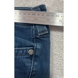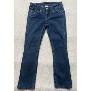 Elevate your denim game with these True Religion straight leg jeans in a dark wash. The classic fit and 5-pocket design make them a versatile addition to your wardrobe. The zip and button closure and belt loops add convenient functionality. The embroidered logo on the back pocket and iconic USA and 90s themes give them a touch of personality. These jeans have a 29-inch inseam and a 30-inch waist size, perfect for women who prefer a low rise. The denim is a cotton blend and machine washable for easy care.
