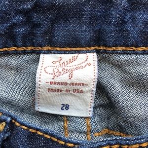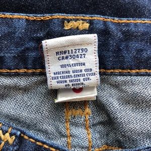 Classic True Religion jeans with a mid-rise and slight flare fit- might be bootcut but unsure (please see photos to determine if these would work for you). Great dark denim that is not faded at all. Classic True Religion stitching with one regular pocket and one flap button-closure pocket.