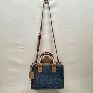 This ladies bag is in excellent pre-owned condition with minimal signs of use. The interior does have a dark mark inside the seam on one side. Please see all photos as this is the exact bag you will receive. Item features double handles and a snap top closure. Inside liner is clean and features an internal slip pocket. Item includes removable key chain and crossbody strap. Measurements are; 10" w, 7.5" h and 4.5" deep with a 4.5" handle drop.