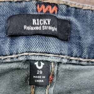 Classic True Religion denim jeans. Features red accent stitching. Iconic back pocket design.
