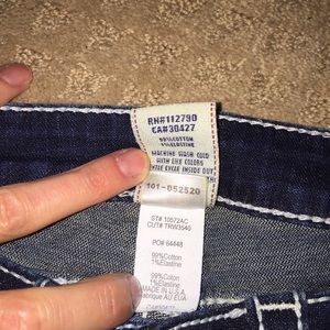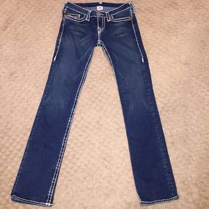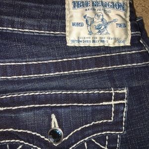 True Religion Disco Billy Big T Jeans, NWOT, Gorgeous! Dark wash, MINT. Light blue crystals on pockets (front & back). Size 29, inseam 34".