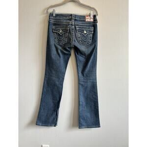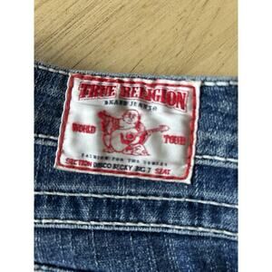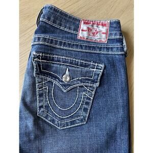 Elevate your cowgirl style with these True Religion flared jeans in a size 26. The jeans feature a solid blue color with bling pockets that add a touch of glam to your outfit. The distressed fabric and low-rise waistband make them perfect for any season, whether it's winter, summer, fall, or spring.