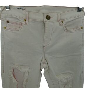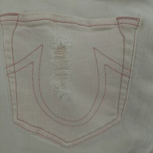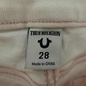Crafted from a premium cotton blend, these True Religion jeans offer a legging-like fit with a light pink wash and distressed style.