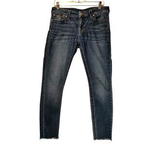 True Religion Distressed Skinny Blue Jeans Flap Pockets Frayed Raw Hem Sz 30