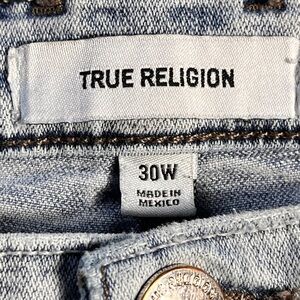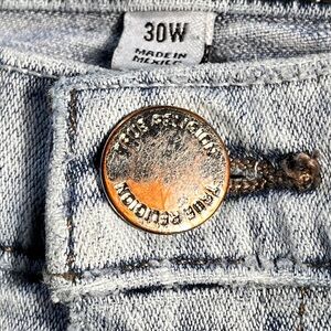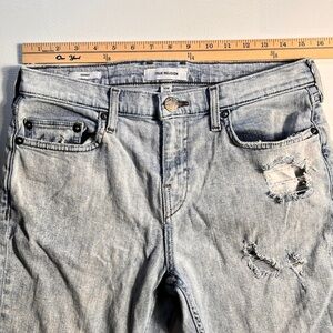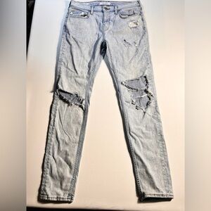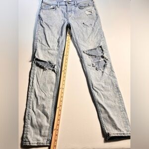 Stylish distressed light blue jeans. Perfect for casual wear.