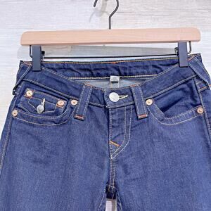 True Religion Flap Boot Cut Jeans Blue Dark Wash Low Rise Stretch Womens 27