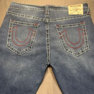 Details: Five-pocket design, zip fly with button closure, belt loops, True Religion logo button, signature horseshoe stitched back pockets, and rear logo patch reading "True Religion Brand Jeans World Tour Fashion For The Senses."