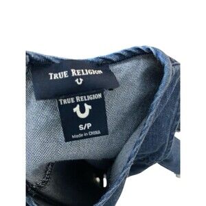 Stylish and comfortable True Religion denim dress for girls, size Small (S/P). Made of 100% Tencel, this soft and breathable blue dress features a trendy flutter sleeve design with intentional distressed edges and hem. The iconic True Religion logo is embroidered on the chest in light pink.