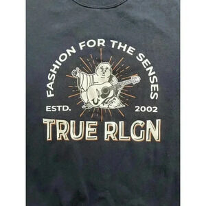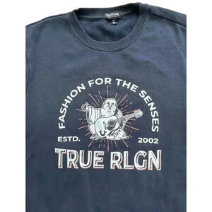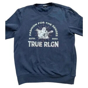 Trendy vintage Y2K True Religion crewneck. Features True Religion logo and the text "Fashion for the senses Estd. 2002 TRUE RLGN" on the front. Night sky colorway. Originally $119. Get your hands on this classic, designer piece!