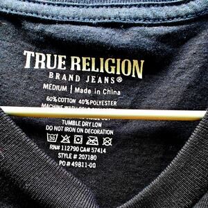Style: Short-sleeve crewneck with large “True Religion / Fashion for the Senses / 2002” and horseshoe logo graphic