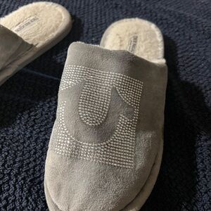 A light grey color with a large glittery “TR” logo on the front of each slipper
