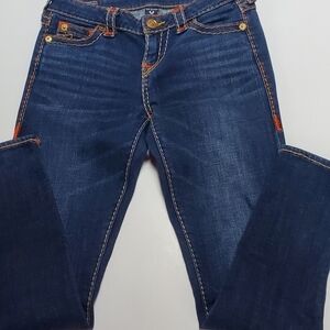 True Religion Halle Mid Rise Super Skinny Jeans, Size 27, mid to dark wash, yellow and orange exposed stitching, Flap Pockets, whiskering as pictured. Good Pre-Owned Condition