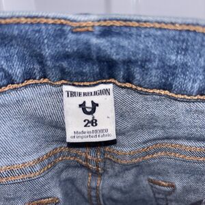 The True Religion Halle Mid-Rise Super Skinny Jeans in size 28/25 are a stylish and versatile wardrobe staple. Made from a comfortable cotton blend denim with a solid blue color and zipper closure, these jeans feature a 5-pocket design and accentuated with the True Religion logo. Perfect for all seasons, these regular fit jeans offer a flattering silhouette for any occasion.