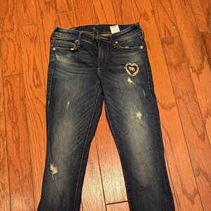 True Religion Stella Medium Wash Jeans Size 25 Buddha, Peace Sign and Heart Patches and Sparkles, Lightly Distressed