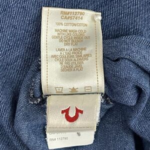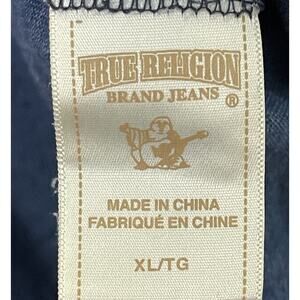 This True Religion shirt for men in size XL features a classic henley neckline and long sleeves, with a solid blue color and knit cotton fabric. The shirt also includes a logo accent, making it a stylish addition to any wardrobe.