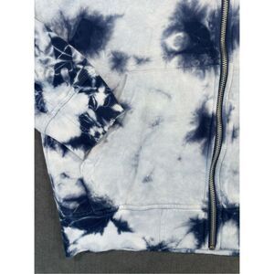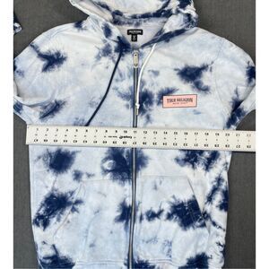This True Religion full-zip hoodie features a bold navy and white tie dye wash for an effortlessly cool, streetwear-ready look. Crafted from a soft fleece blend, it includes an adjustable drawstring hood, kangaroo pockets, and a branded zipper pull for signature appeal. The relaxed fit makes it ideal for everyday layering, lounging, or adding a pop of color to casual outfits. Please see photos for measurements.