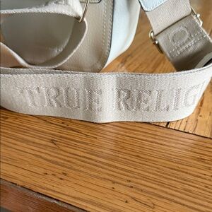 Chic True Religion mini bag in tan. Features a bold gold logo accent. Perfect for stylish outings.