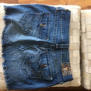 Super cute middle dark wash denim, two pockets in the back! Frayed at the bottom a tad!