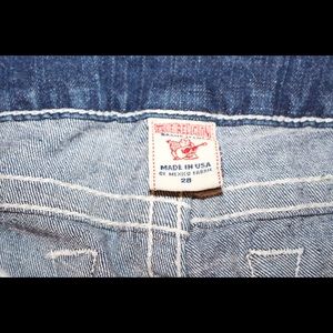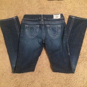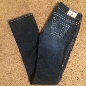 Women's Johnny True Religion Jeans, Slim Straight Leg. Light wash with white stitching, only worn once look brand new.