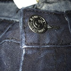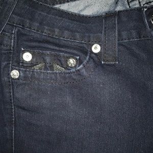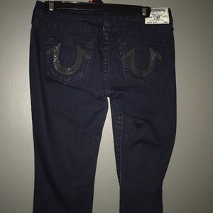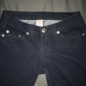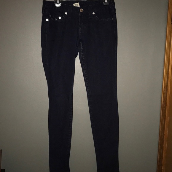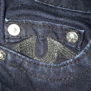 These True Religion jeans are dark skinny jeans. The True Religion symbol sparkles on the back pockets. Very tight jeans!