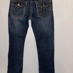 This listing is for a pair of True Religion jeans, bluish grey, in a good used condition. Please ask any questions related to the item. Any reasonable offers welcomed. Straight leg. They have a button that was replaced. The front button is not original as the other one got lost. They are lighter than on the photos.