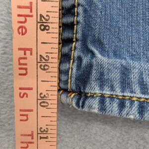 Condition notes: Heavy distressing with torn/frayed coin pocket, small holes on front thigh and rear pocket/seat, scattered dark specks/marks, and frayed leg openings—see photos