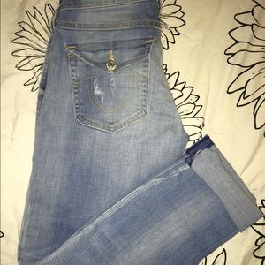 Audrey slim boyfriend fit, distressed with patching on inside (made that way), authentic in perfect condition