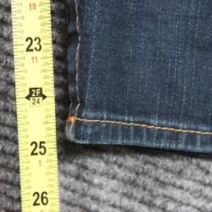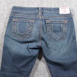 Classic True Religion “Lizzy” jeans in a dark indigo wash with contrast stitching and signature back pocket arches. Made in USA from soft stretch denim for a comfy, curve-flattering fit that hits around the ankle (25" inseam) – perfect with sneakers, sandals or boots. Gently pre-owned with normal light wear and a little rub at the hems, no major flaws noted. Color may vary slightly from photos due to lighting and monitor settings.