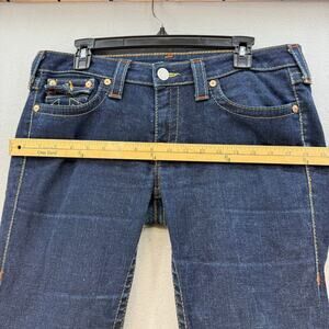 True Religion Women's Denim Jeans. Blue in color. Dark denim wash. Tagged size 32 (14). These women's True Religion jeans feature a five pocket design, a flare pant with a wrap around seam, and a mid rise fit. Style number 10-503. In preowned condition with minimal signs of wear.